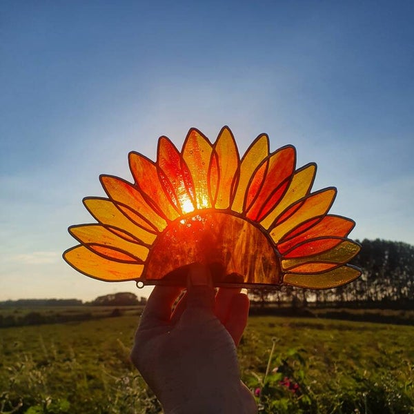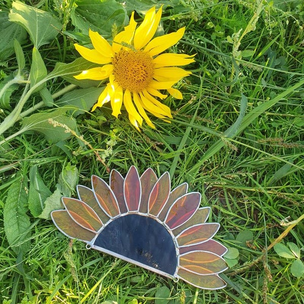 Prachtige halve zonnebloem voor in het raam, deur kozijn, kast of ieder stukje waar je deze bloem wilt hangen. Aan jouw de keuze hoe deze bloem zijn zonneschijn met jou deelt!