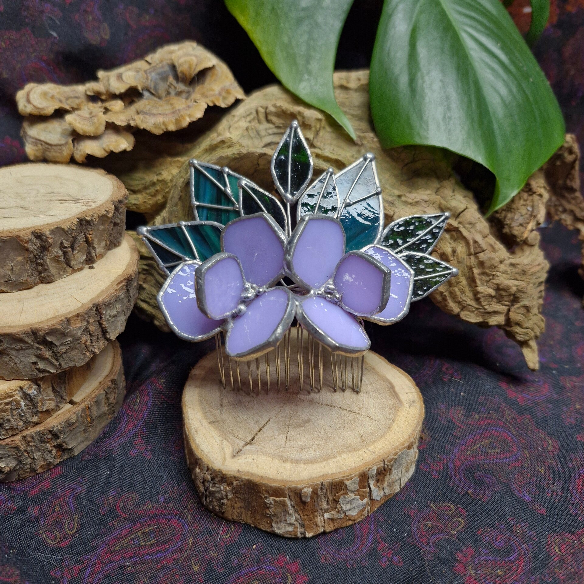 Haarpin met lila glazen bloemetjes en donker groene blaadjes.