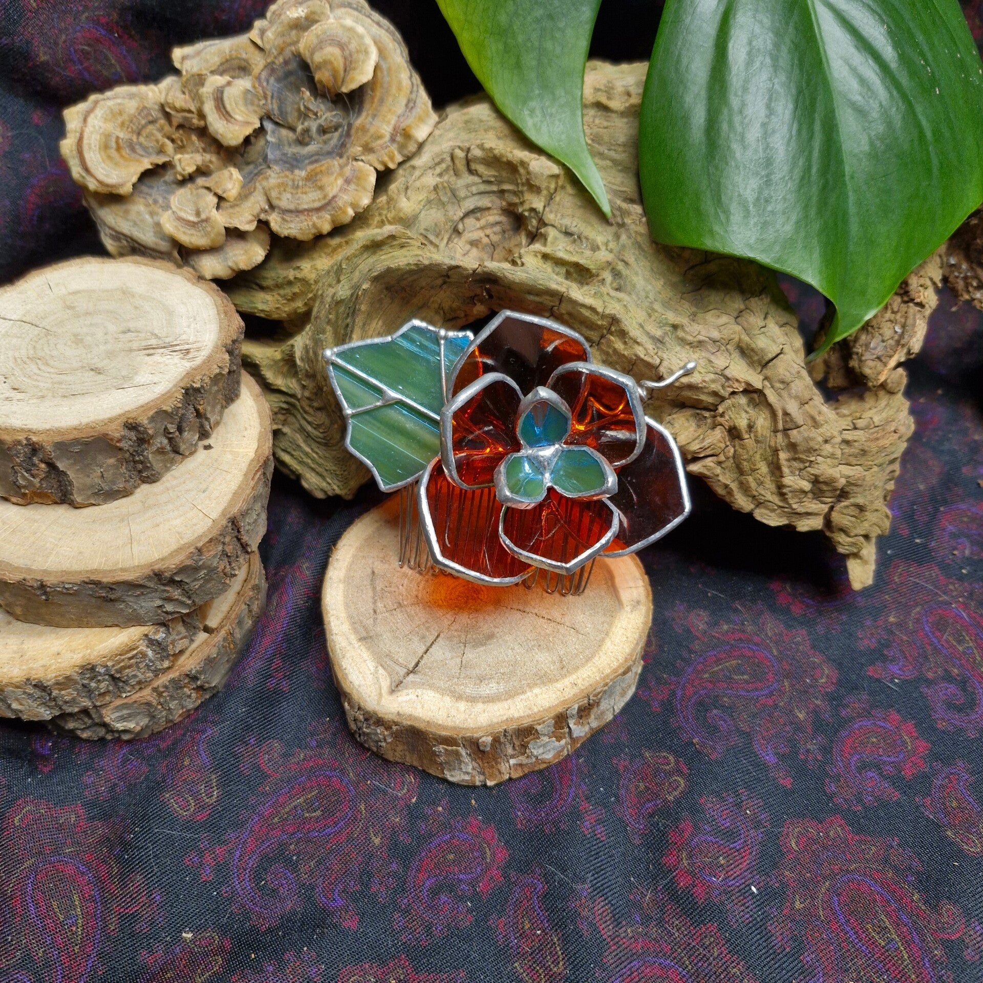 Haarpin met doorzichtige oranje bloemetjes en iridiserent blad en kroon. Deze pin is geinspireerd op pompoen bloemen.