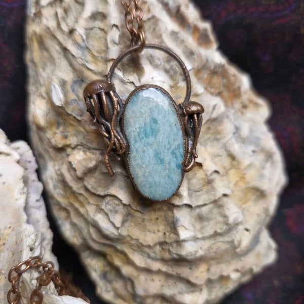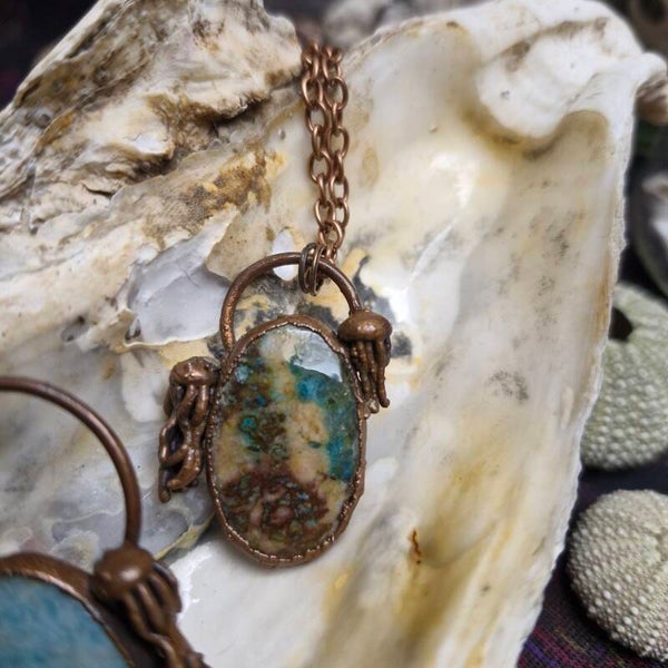 Hangers gemaakt voor echte zeewezens, met koper overgroeide mini kwalletjes gecombineerd met de mooiste turquoise stenen en maansteen.