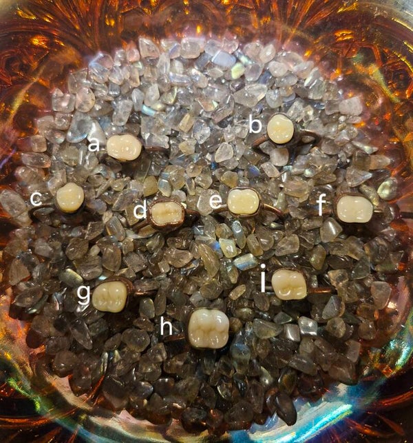 Tanden uit een kunstgebit overgroeid met koper op een smalle ring.