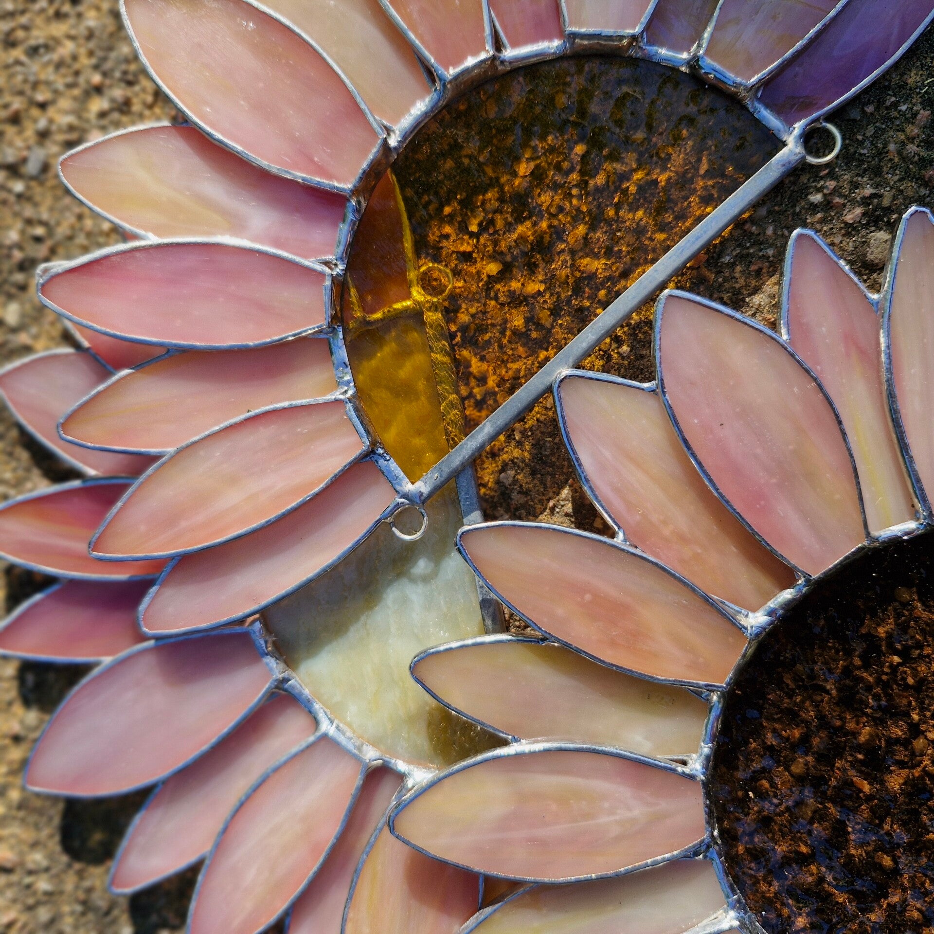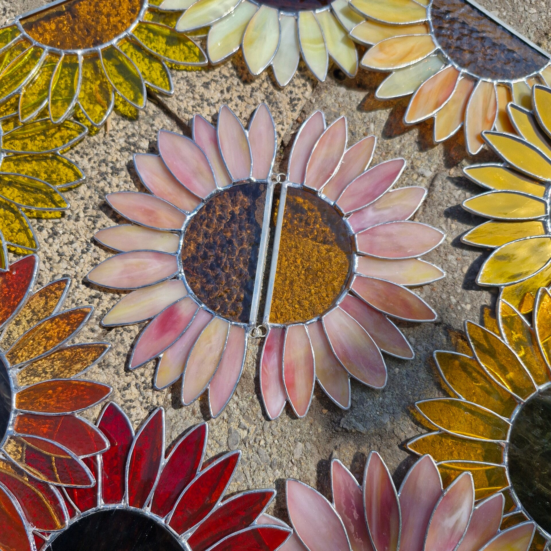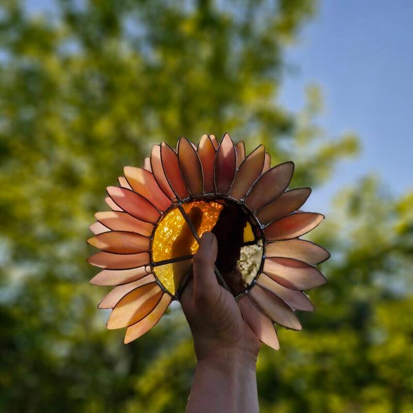 Halve zonnebloem met 2 oogjes om op te hangen of weg te zetten in je kozijn.