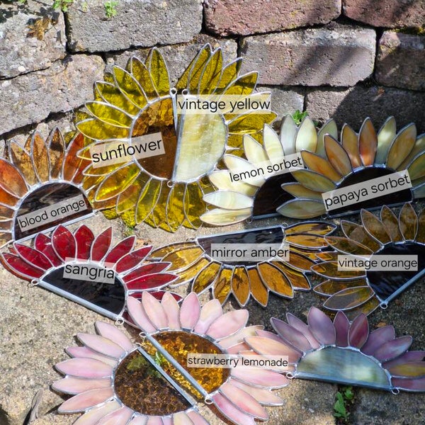 Vintage yellow: uit een vintage stuk mond geblazen glas met veel langwerpige bellen in het glas wat echt een zonnebloem blaadjes effect geeft. Met een geel textuur hart