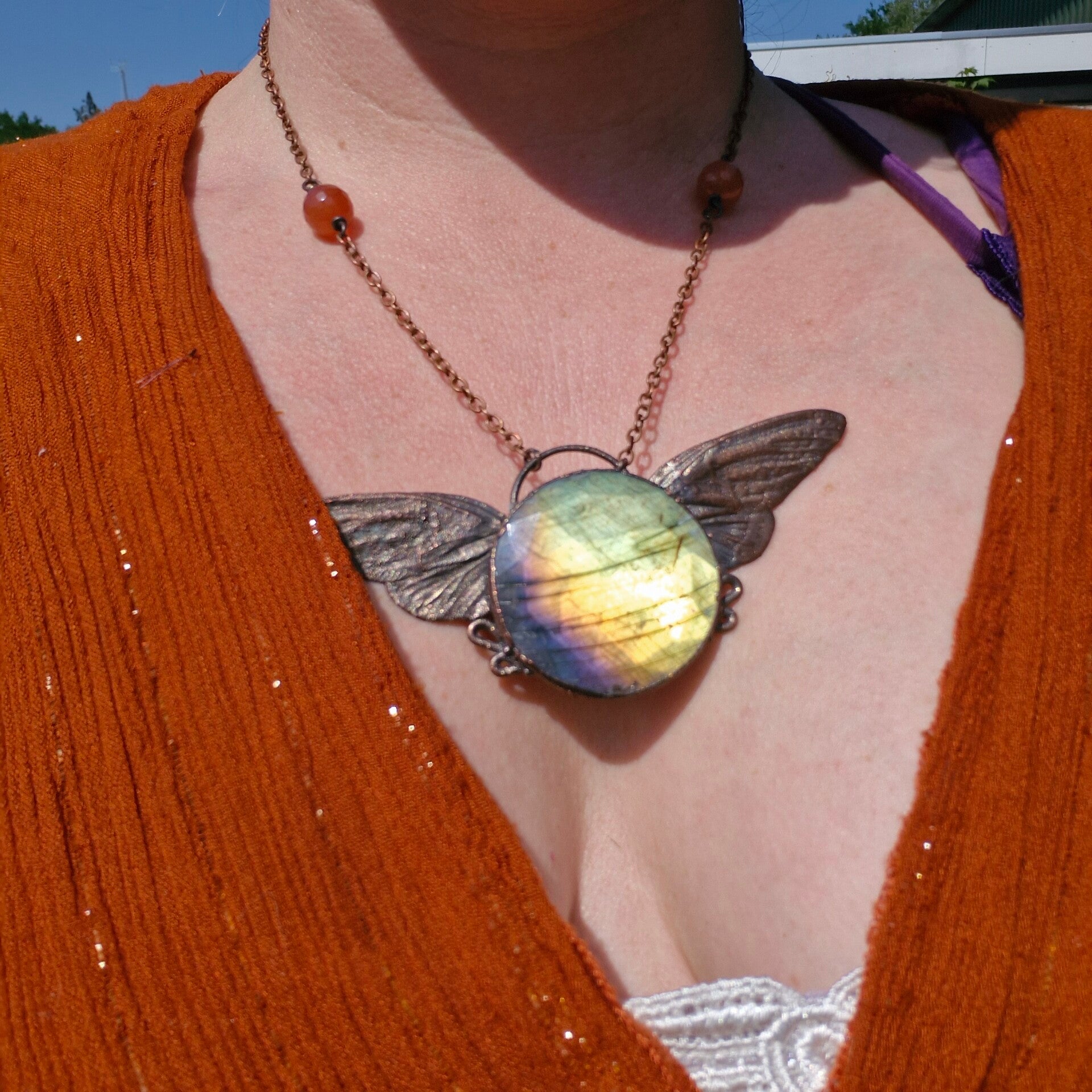 Deze prachtige zonsondergang labradoriet met een ongelooflijk mooie rainbow flash, echte cicade vleugels en fairy vibe details heeft een lengte van +/-30cm, de hanger zelf is 11x5 cm.