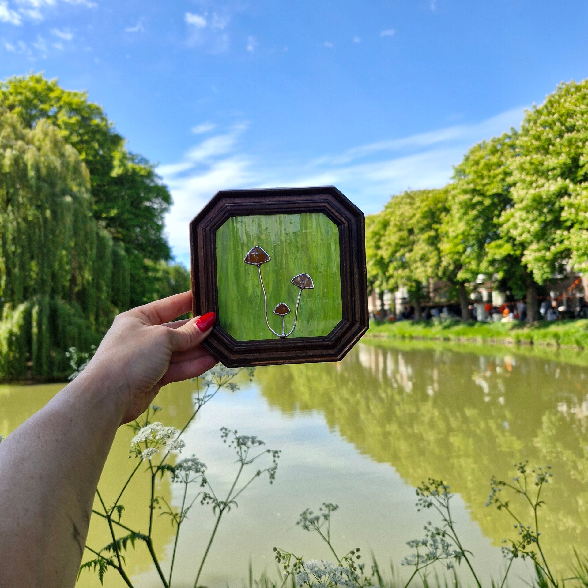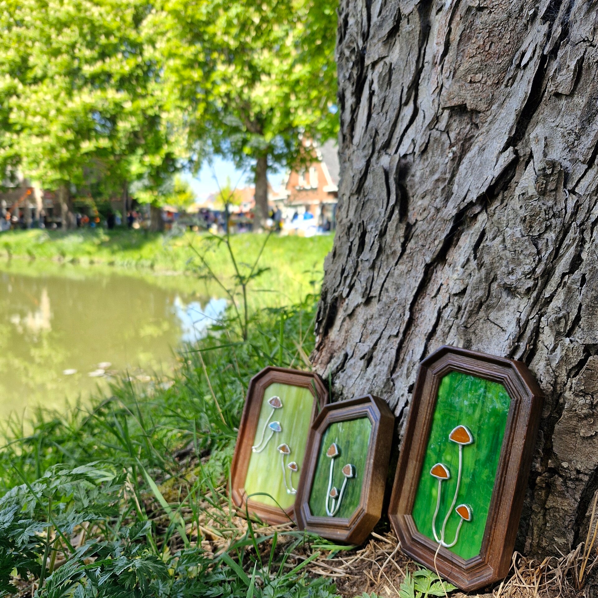 Orange ink caps op frisse groene achtegrond in "hout" look frame.