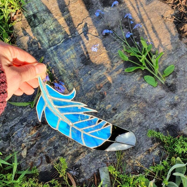 Deze suncatcher veer is maarliefst 29 cm lang. Je hangt hem waar je wilt aan het oogje.